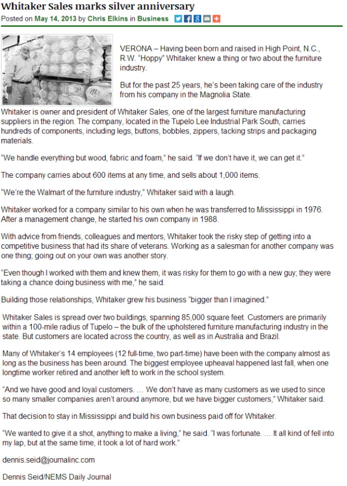 Founded in 1988 by R.W. "Hoppy" Whitaker, the name Whitaker Sales has become synonymous with SERVICE in the upholstered furniture manufacturing industry. Our experienced staff understands what you need to be successful and work hard to make sure we are a partner in that success.
